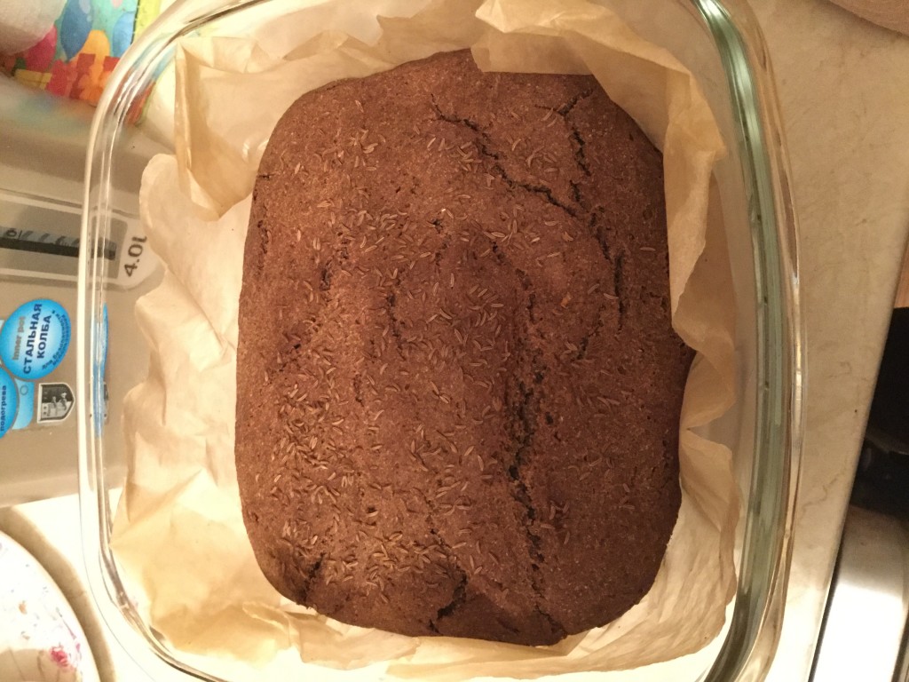 Тесто обмять и поместить в форму, смазанную растительным маслом и застеленную пергаментом. Размер моей формы 26х12 см. Посыпать тесто сверху зернами кориандра и тмина, чуть вдавливая их. Прикрыть тесто пленкой и оставить в тепле на 2-3 часа. Выпекать хлеб 15 минут в разогретой до 220 градусов духовке с паром (поставить миску с горячей водой на низ духовки). После чего температуру уменьшить до 190 градусов и убрать воду. Выпекать хлеб еще около 50-60 минут.
