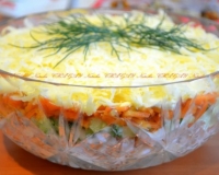 Салат жутко неудачный. Никто из гостей его не ел. Всё дело в том, что огурцы дали много сока, да и морковь, наверное, тоже. Салат рекомендовали охладить, так вот после холодильника все ингредиенты 4-х нижних слоев плавали в миске под слоем сыра. Извиняюсь за отрицательный отзыв, но я так рассчитывала на этот салат за праздничным столом)))))