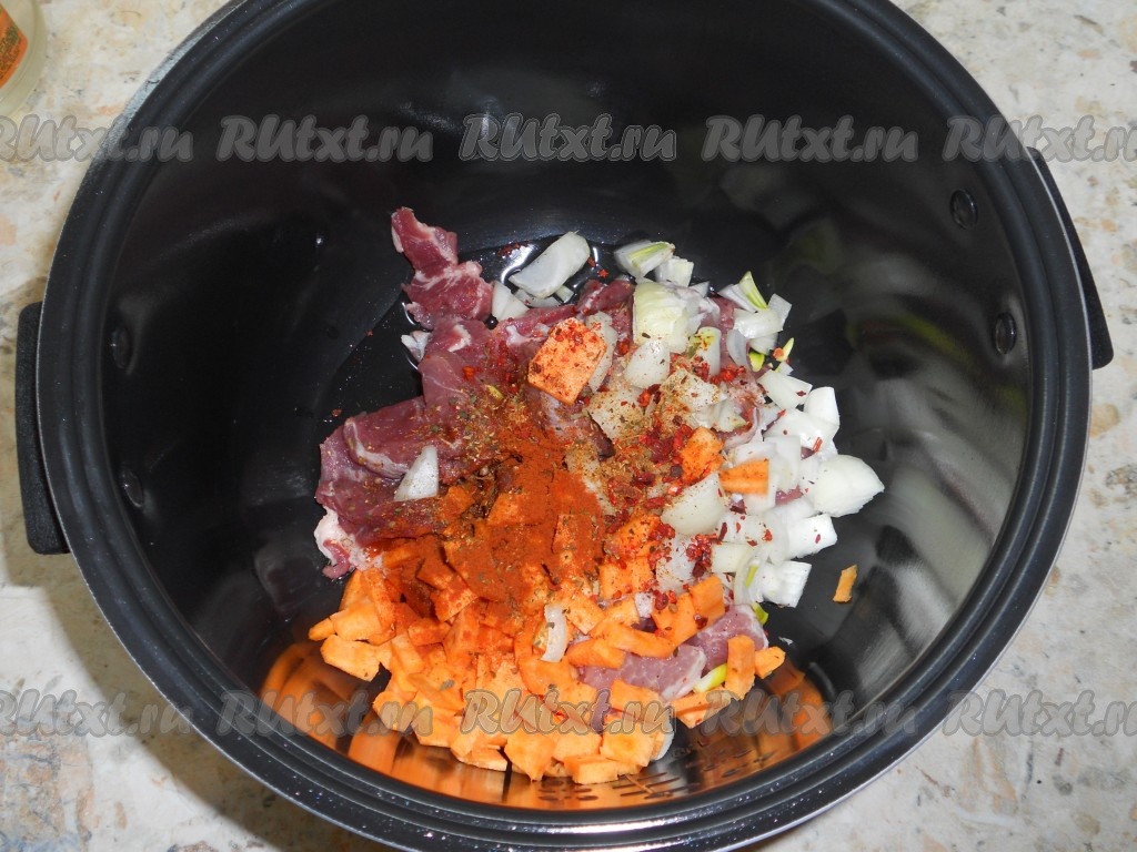 Свинину, лук и морковь выложить в чашу мультиварки, влить растительное масло. Посолить, посыпать специями, добавить два вида паприки и красный молотый перец.