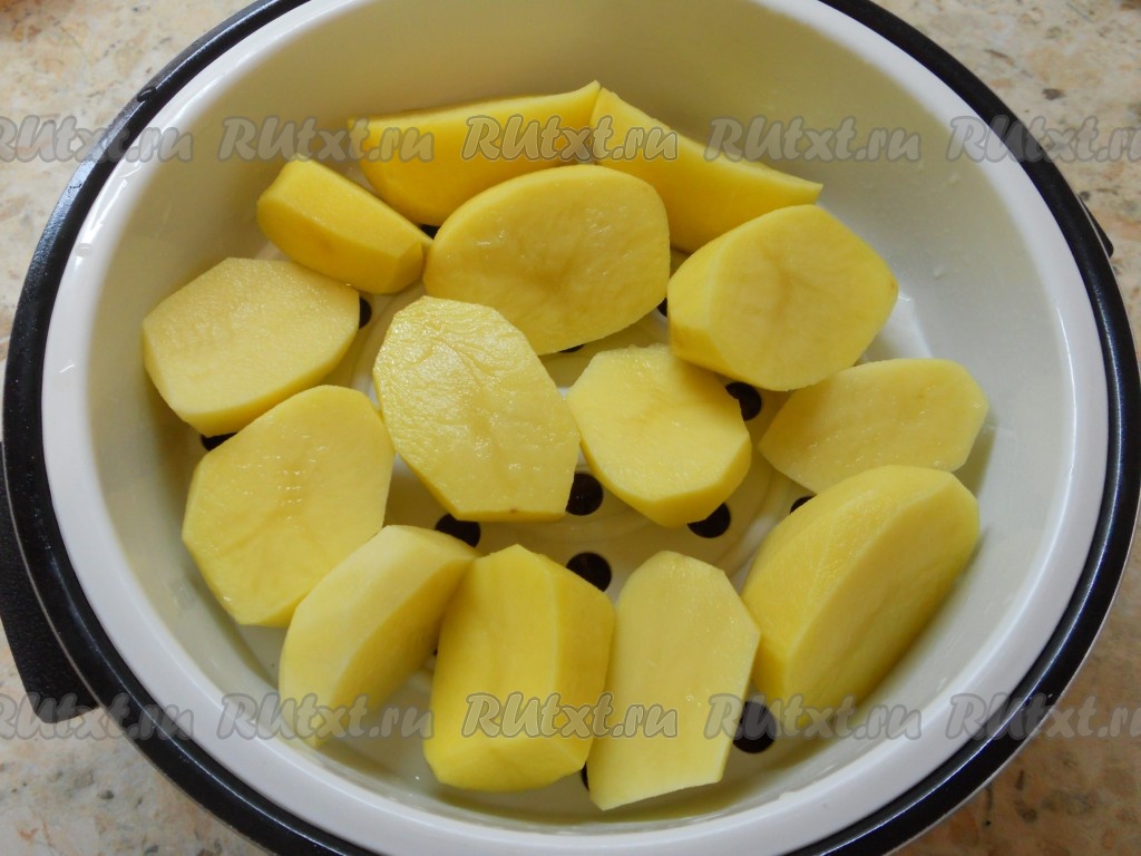 Картофель очистить, помыть, разрезать вдоль на 2 части. Выложить картофель в контейнер для готовки на пару и поместить его в мультиварку.