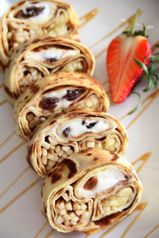 Аппетитный, очень вкусный блинный рулет с начинкой нарезать на кусочки и выложить на плоскую тарелку. Тарелочку можно полить сиропом или сгущёнкой, по желанию украсить мятой или свежими ягодами.