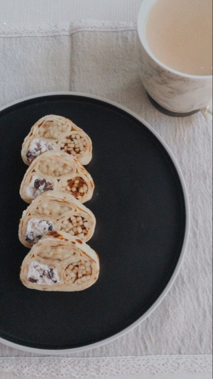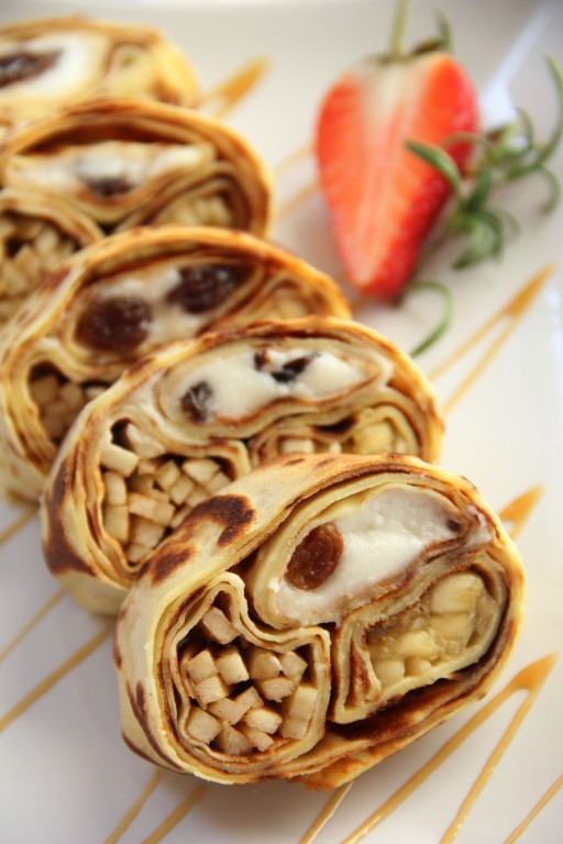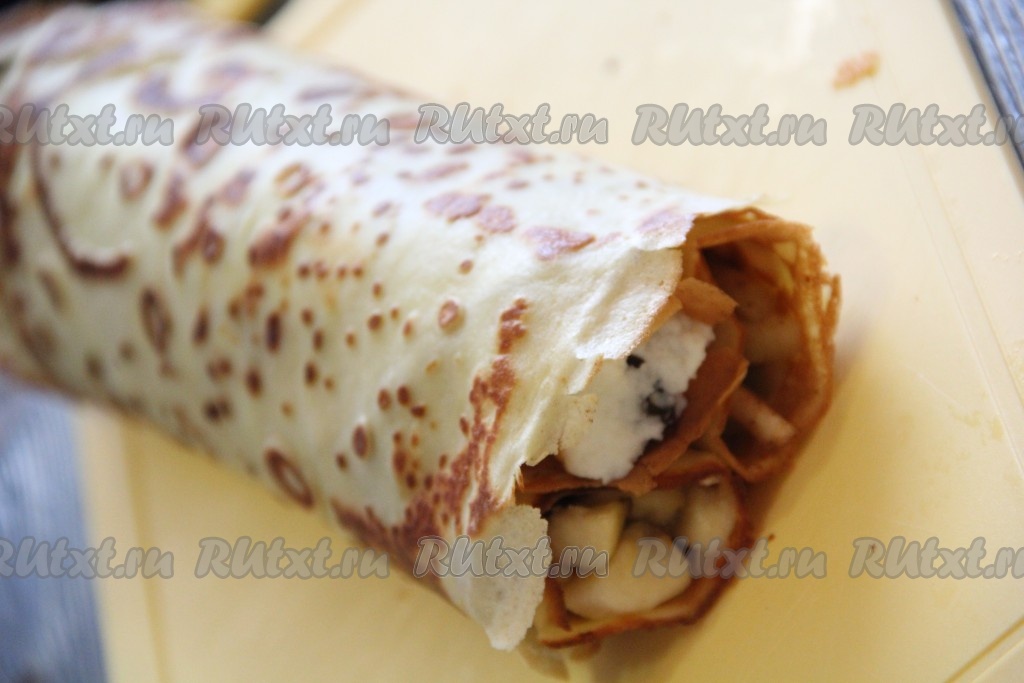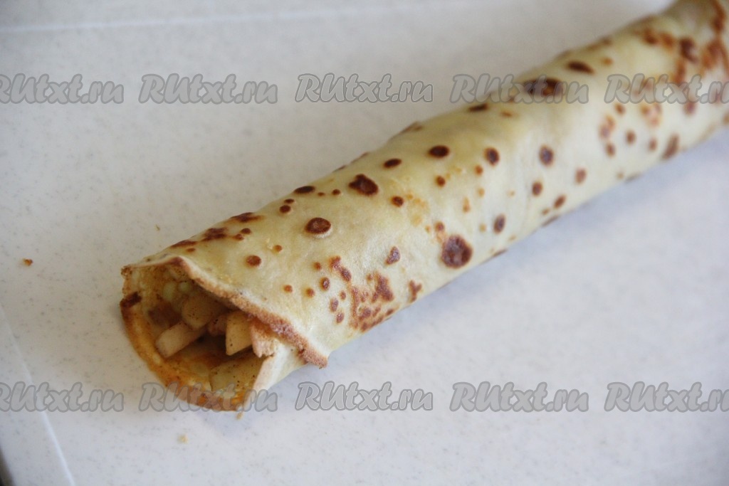 Свернуть блин с яблочной начинкой в плотную трубочку.