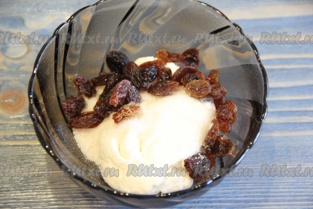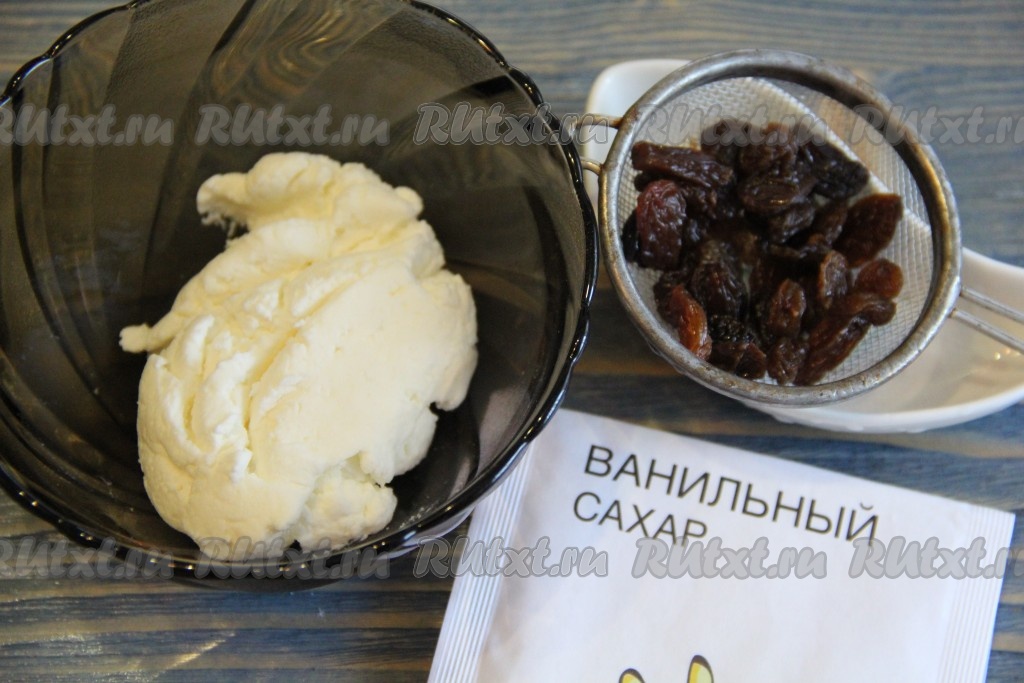 Соединить творог, изюм и ванильный сахар. Всё тщательно перемешать.