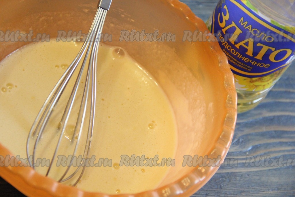 Всё хорошо перемешать, добавить растительное масло. Ещё раз перемешать, наше тесто для блинчиков готово. Тесто получится обычной блинной консистенции - не густое.