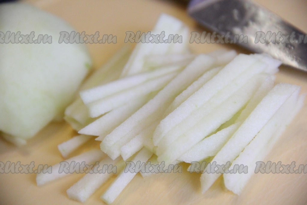 Яблоко очистить от кожуры и семян. Нарезать яблоко тонкой соломкой.
