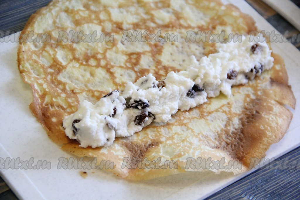 Готовые блинчики слегка остудить. Выложить на блин творожную начинку.