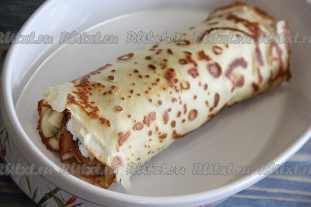 Свернуть блин с бананом в плотную трубочку.