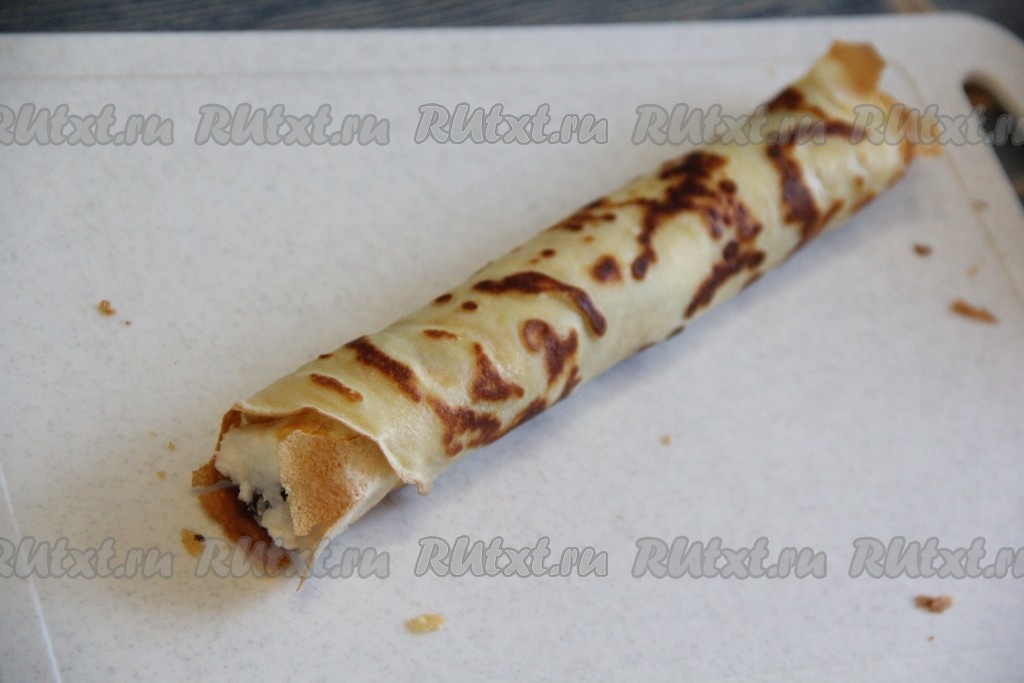 Свернуть блин с начинкой в плотную трубочку.