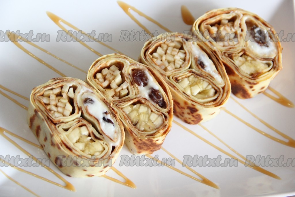 Хочу поделиться интересным рецептом блинного рулета с начинкой. В роли начинки будем использовать творог, изюм, банан и яблоко. Рулет получается не только вкусным, но ещё и очень красивым. Рецепт для блинов можно использовать любой (я готовила блины на молоке).