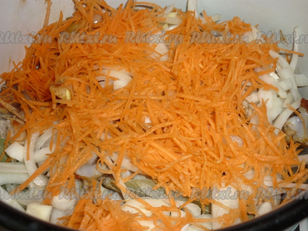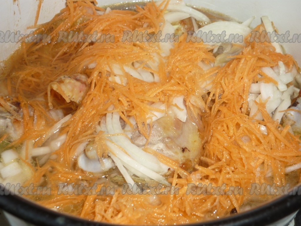 Обжаренные кусочки курицы переложить в кастрюлю, добавить лавровый лист, нарезанный полукольцами лук и натёртую на крупной тёрке морковь, посолить, поперчить.