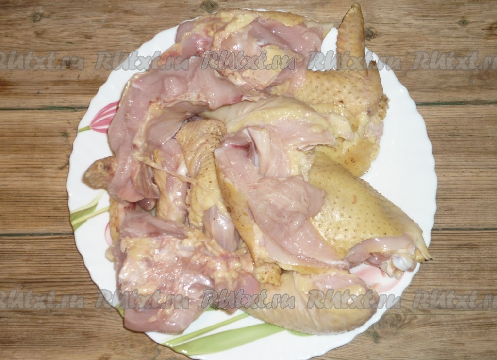 Вымыть курицу и разрезать на порционные кусочки.