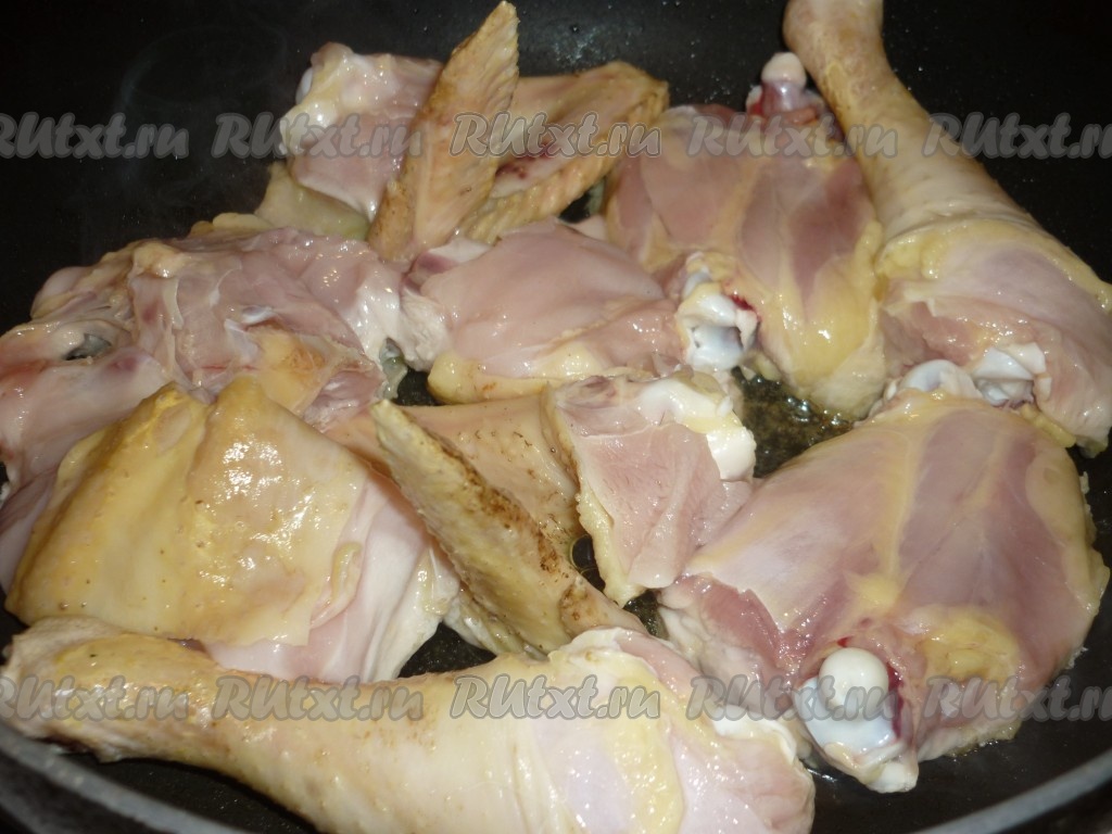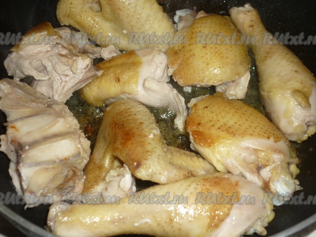 На сковороде разогреть растительное масло, выложить кусочки домашней курочки и обжарить со всех сторон до золотистой корочки.