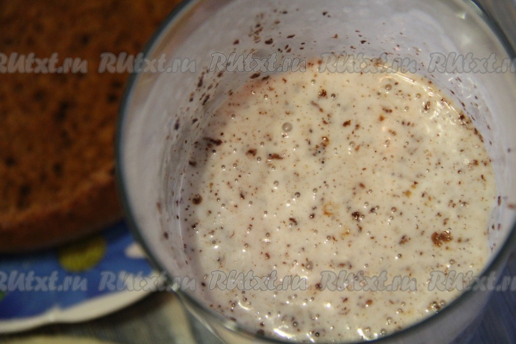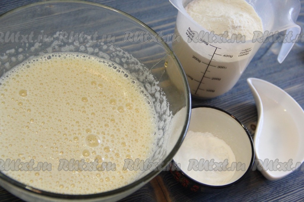 Для начала приготовить корж. Яйца соединить с сахаром и хорошо взбить миксером в течение 5 минут. Затем добавить мёд и ещё раз взбить до однородного состояния. Если мёд засахаренный или слишком густой, лучше разогреть его на водяной бане до жидкого состояния.
