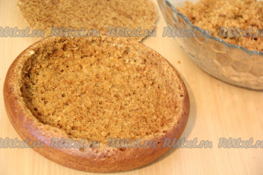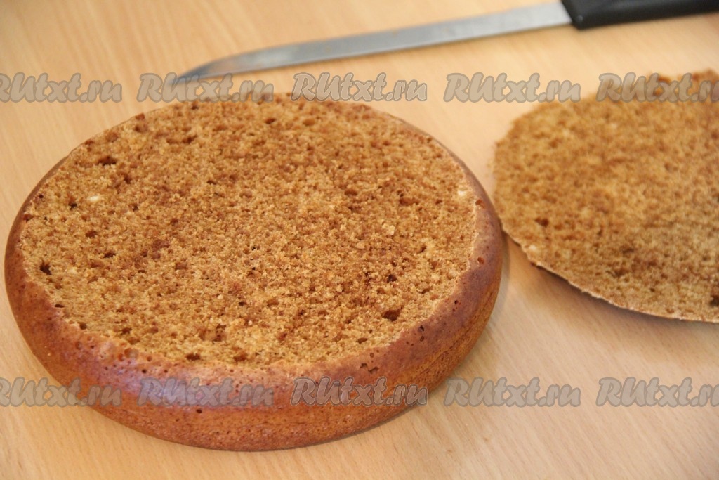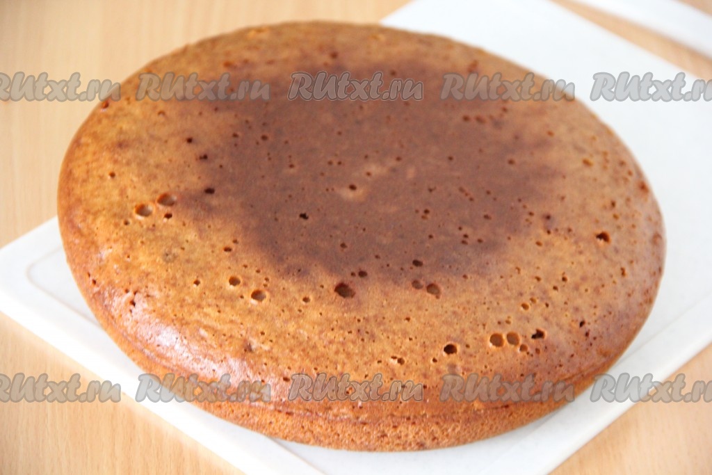 Готовый корж достать и остудить. Если выпекать в духовке, тогда вылить тесто в форму, смазанную маслом, и выпекать в разогретой духовке при температуре 200 градусов примерно 45 минут (до сухой зубочистки).