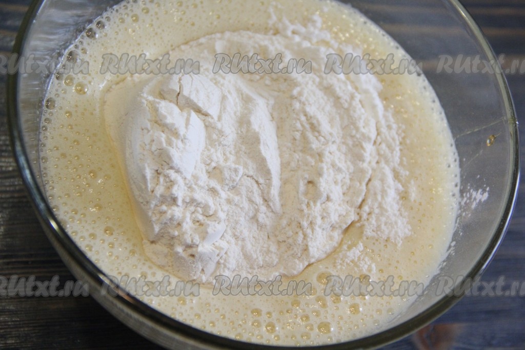 Соду предварительно погасить лимонным соком или уксусом. Добавить в яичную массу просеянную муку, крахмал и соду.