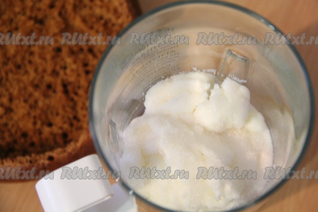 Творог поместить в чашу блендера и всыпать сахар. Пробить творог с сахаром до однородности.
