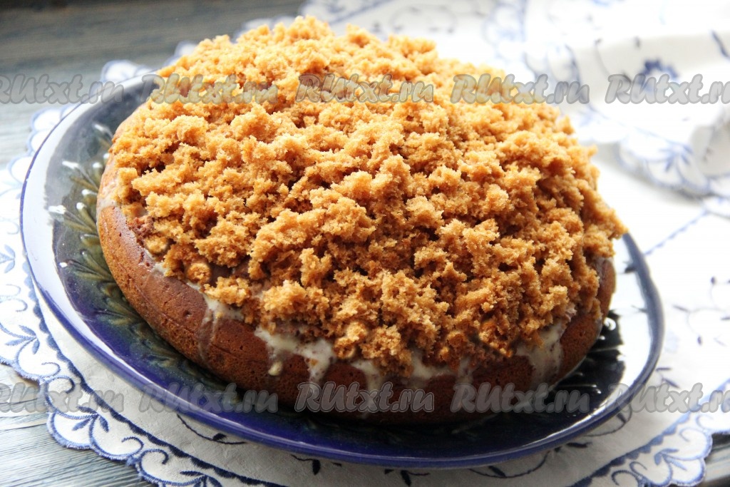 Мякиш коржа раскрошить в крошку и посыпать поверх бананов. Слегка полить творожной смесью.