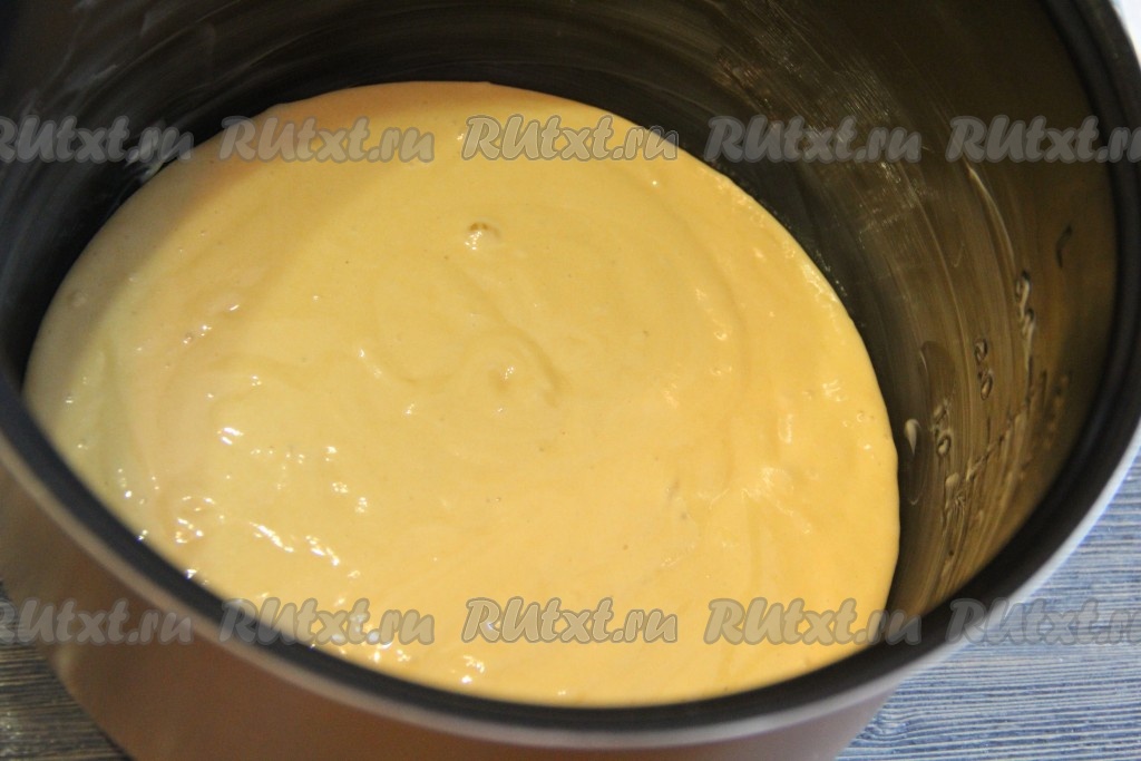 Чашу мультиварки смазать сливочным маслом, вылить тесто в чашу. Выпекать на режиме "Выпечка" 50 минут. Я за 10 минут до готовности перевернула корж.