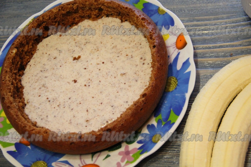 На дно коржа влить немного творожной массы. Бананы очистить.