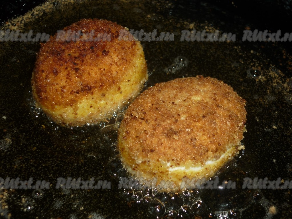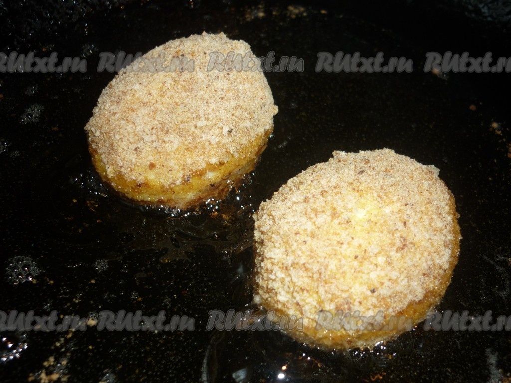 В сковороду налить растительное масло (высотой примерно в палец), хорошо разогреть, выложить яйца в панировке и обжарить до румяной корочки со всех сторон.