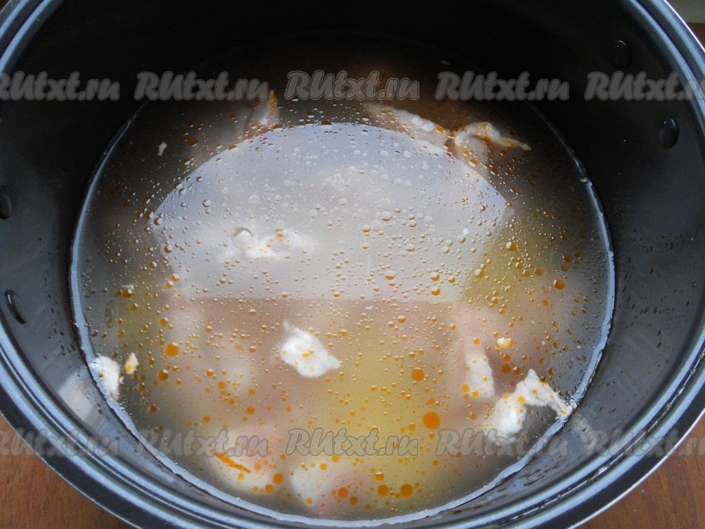 Залить водой, перемешать. Закрыть крышку и выставить программу "Суп" на 1 час.