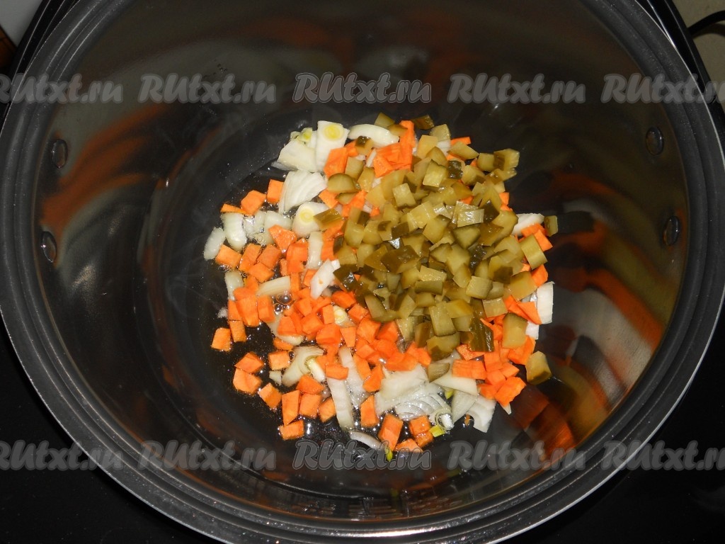 В чашу мультиварки влить растительное масло, выставить программу "Жарка" на 15 минут. Выложить в чашу лук и морковь, добавить нарезанные небольшими кубиками соленые огурцы.