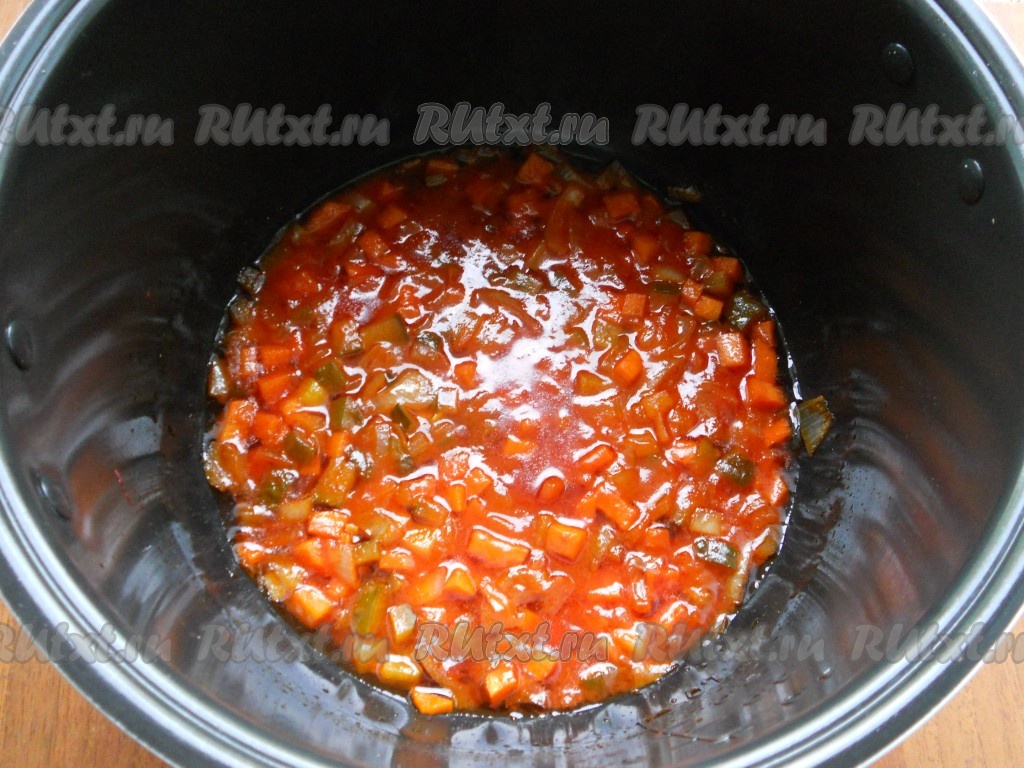 Добавить томатную пасту, влить огуречный рассол и готовить овощи при открытой крышке, периодически перемешивая, до окончания программы.
