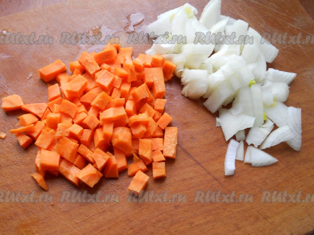 Лук репчатый и морковь очистить и нарезать маленькими кубиками.