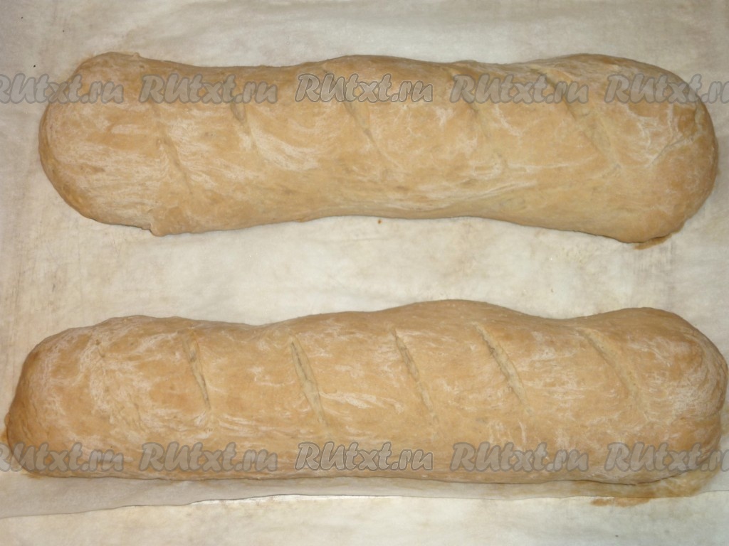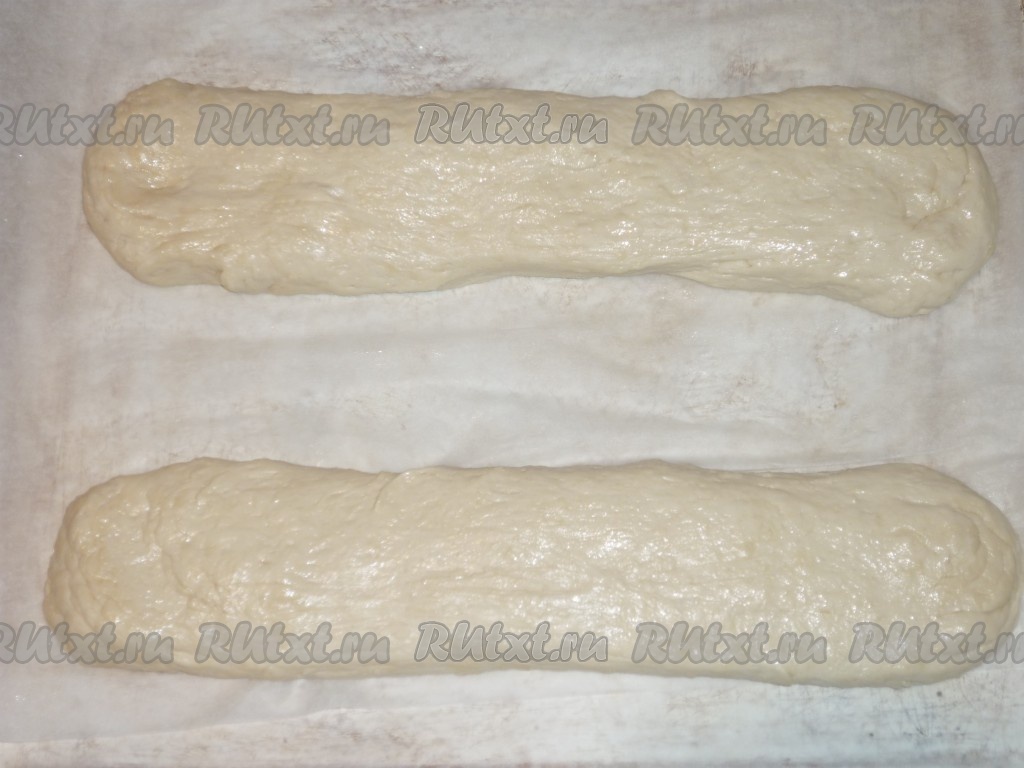 Разделить подошедшее дрожжевое тесто на две равные части. Смазать руки растительным маслом и вытянуть каждую часть теста в длинный багет. Выложить хлеб на противень, застеленный пекарской бумагой, накрыть полотенцем и оставить на 15 минут для подхода.