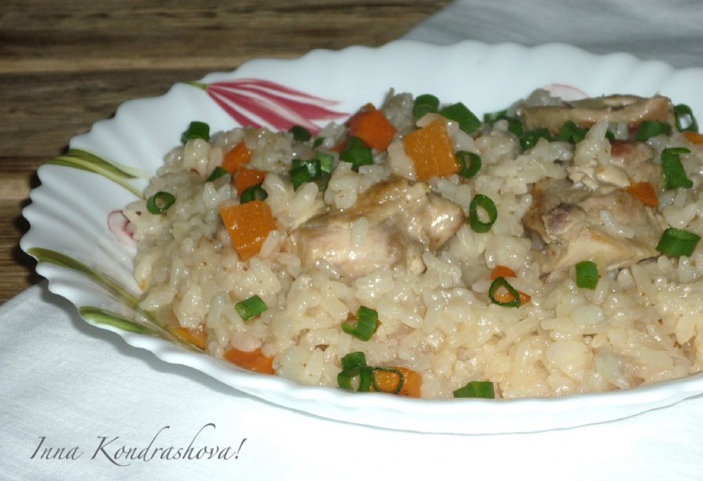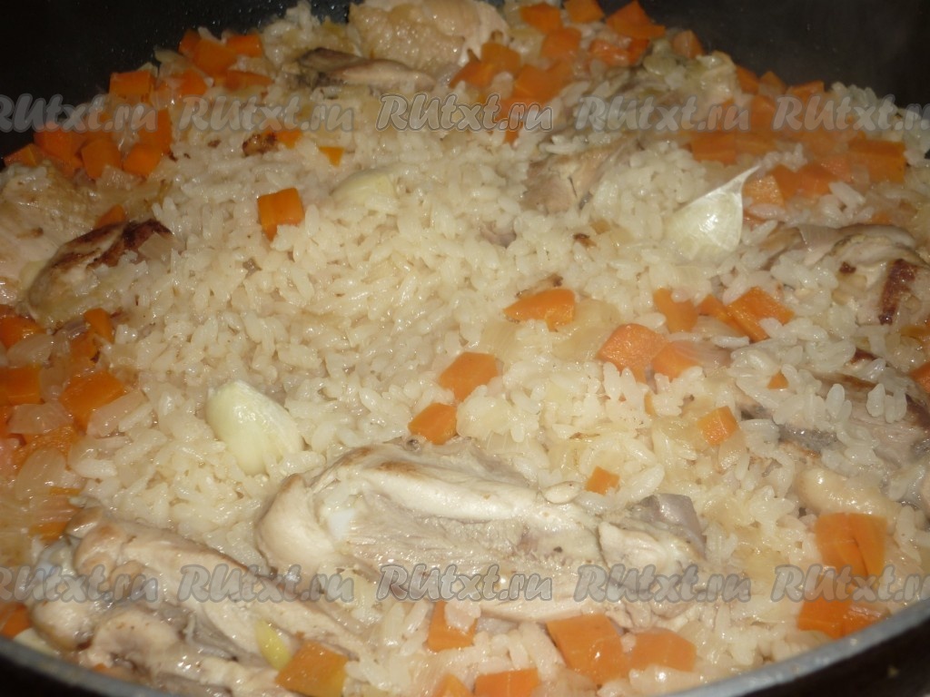 Влить 400 миллилитров кипящей воды, довести до кипения, накрыть сковороду крышкой и готовить на небольшом огне минут 30 (рис должен стать мягким, вода должна полностью испариться). За 5 минут до готовности воткнуть в рис неочищенные, предварительно вымытые, зубчики чеснока.