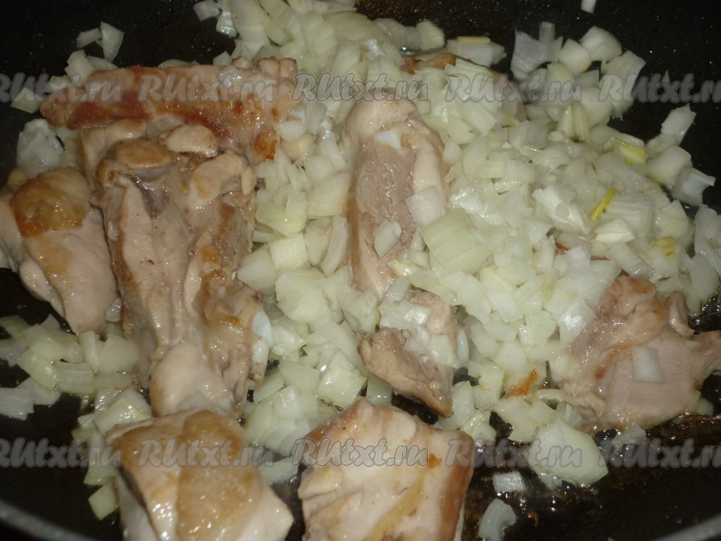 Очищенный лук нарезать на мелкие кубики, добавить в сковороду с обжаренным мясом. Периодически перемешивая, обжарить лук до прозрачности (на это потребуется минуты 3).