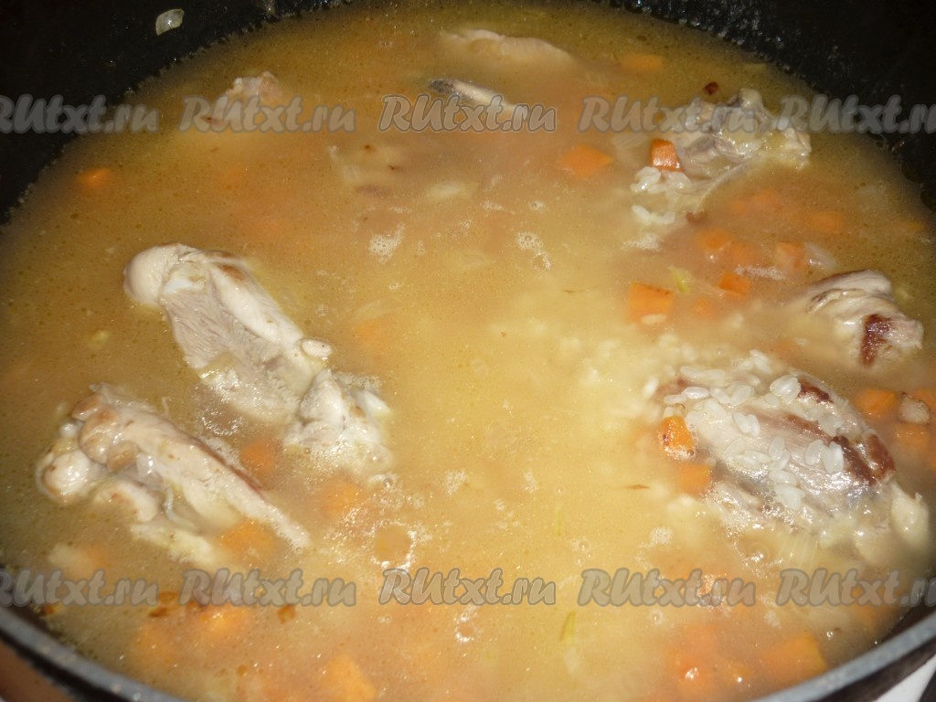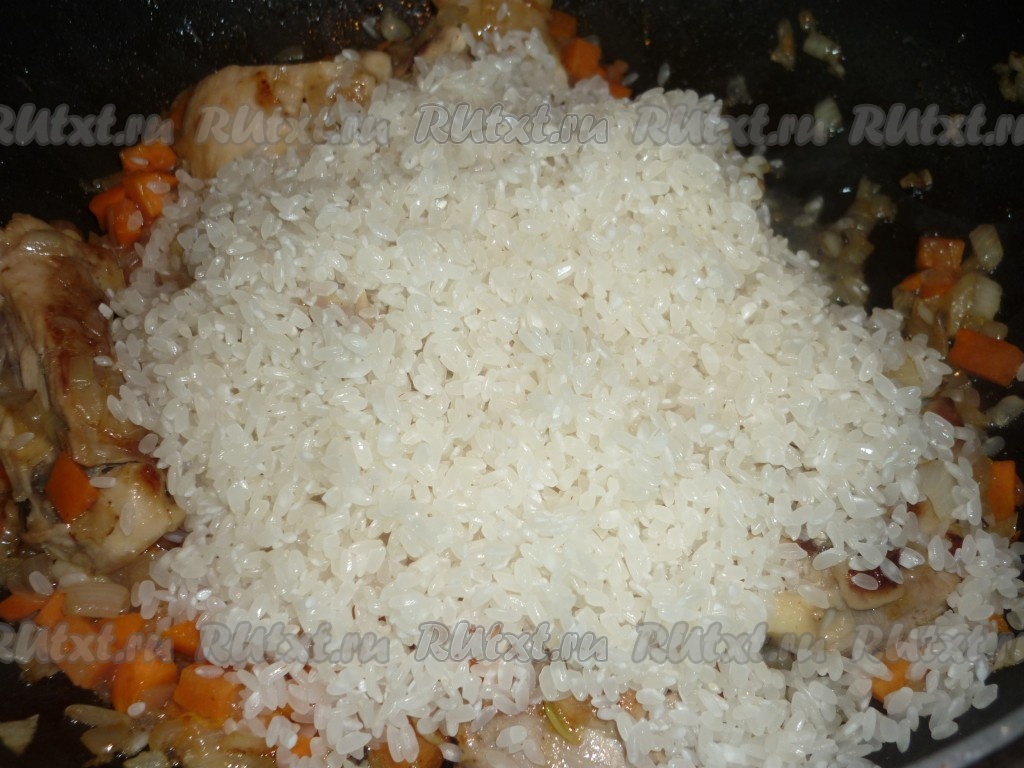 Рис хорошо промыть под проточной воде, лишней воде дать стечь. Рис добавить в сковороду с куриными бёдрами и овощами, разровнять ложкой.