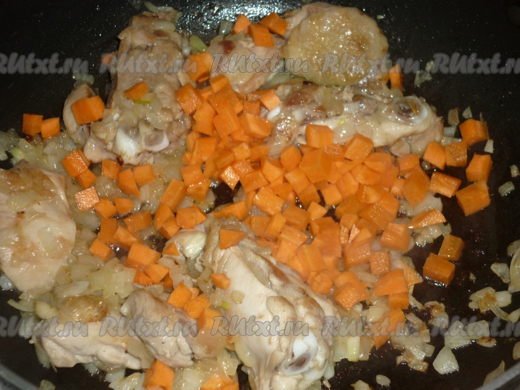 Затем добавить очищенную и нарезанную на мелкие кубики (или натёртую на крупной тёрке) морковь, перемешать и обжаривать овощи с куриными бёдрами ещё 5-6 минут (морковка должна стать достаточно мягкой), иногда перемешивая. Затем всыпать соль и специи, перемешать.