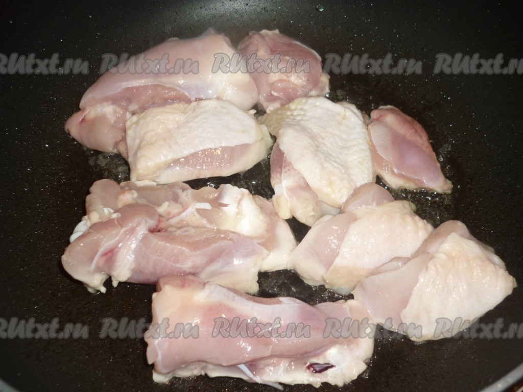 Каждое куриное бедро разрезать на 2-3 части. На сковороде разогреть растительное масло, выложить кусочки куриных бёдер и обжарить на среднем огне до румяности с двух сторон (примерно по 5 минут с каждой стороны).