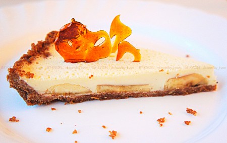 Сливки снова поставить на небольшой огонь и при постоянном помешивании ввести желатин. Продолжать готовить до полного растворения желатина. !Не кипятить. Снять с огня. Дать остыть 2-3 минуты. Вылить полученную массу поверх бананов.