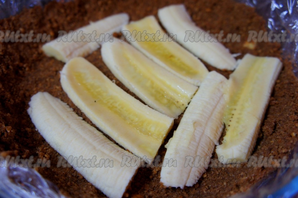 Банан разрезать вдоль, уложить на основу из печенья.