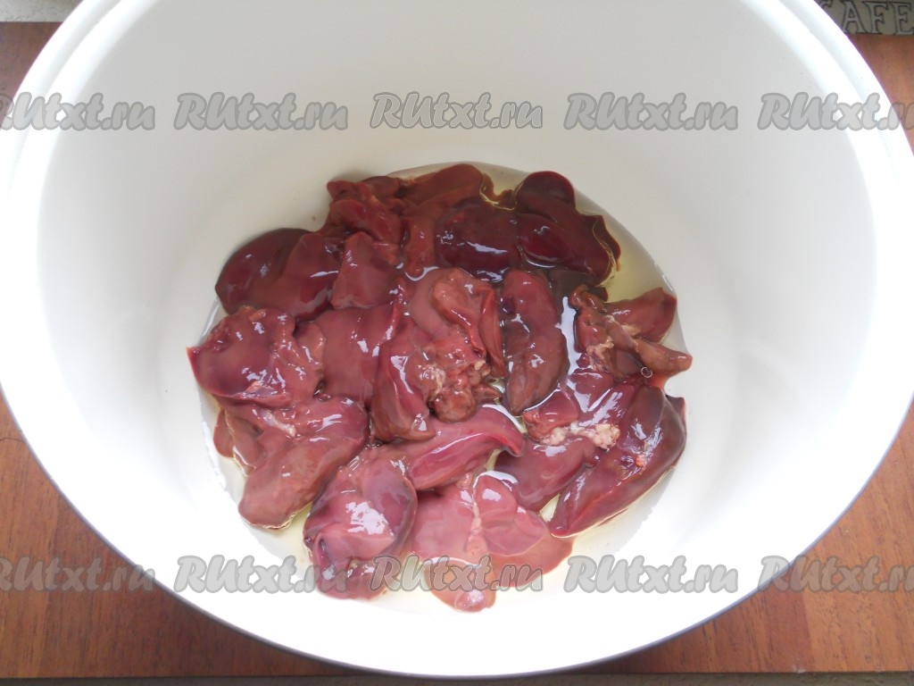Куриную печень хорошо промыть в дуршлаге. Дать стечь воде. Разделить печень на 2-4 части и выложить ее в чашу мультиварки. Влить растительное масло.