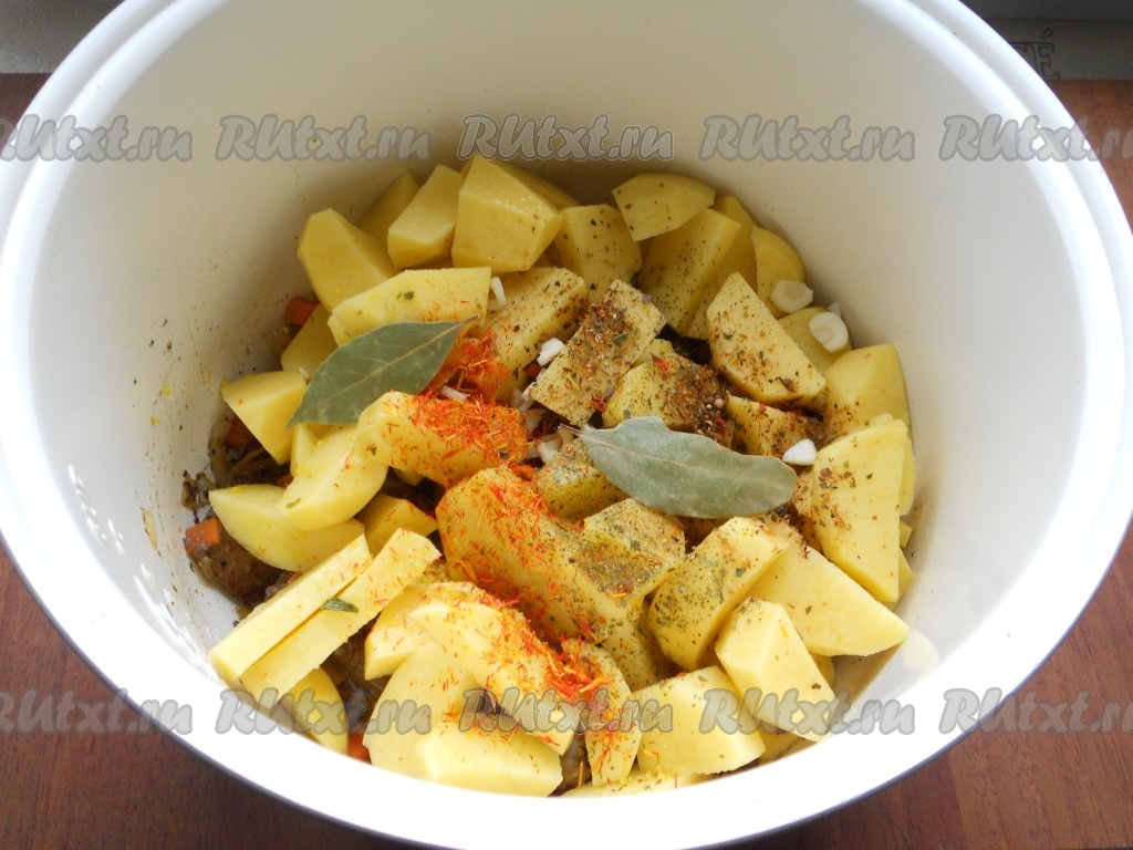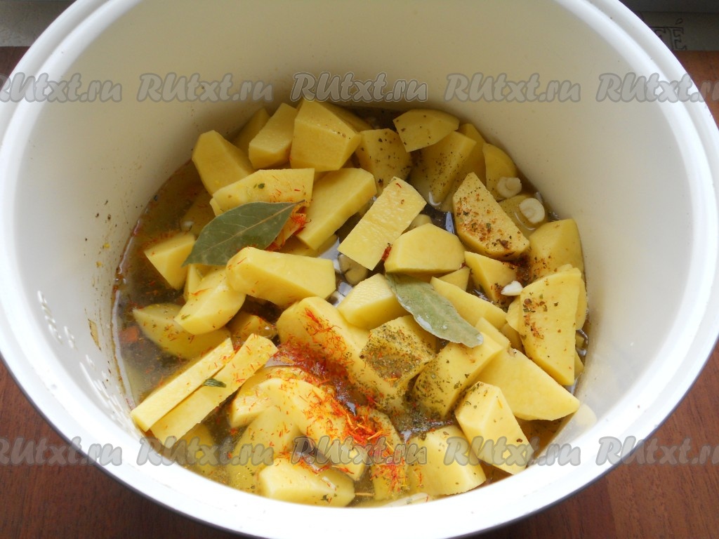 Затем добавить к печени нарезанный крупными кусками очищенный картофель. Всыпать соль, свежемолотый перец, добавить шафран, хмели-сунели, немного специй для мяса, лавровый лист и измельченный чеснок.