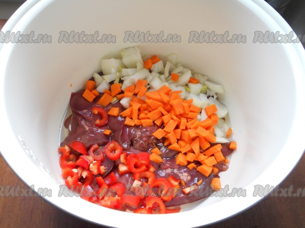Добавить в чашу нарезанные кубиками лук и морковь, соломкой или кусочками сладкий перец. Выставить программу мультиварки "Жарка" на 20 минут. Готовить с открытой крышкой, через 10 минут печень с овощами аккуратно перемешать. Далее готовить до сигнала.