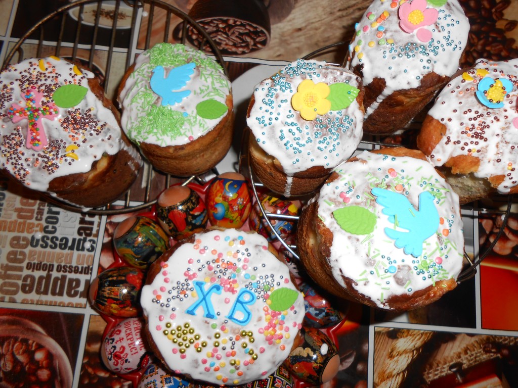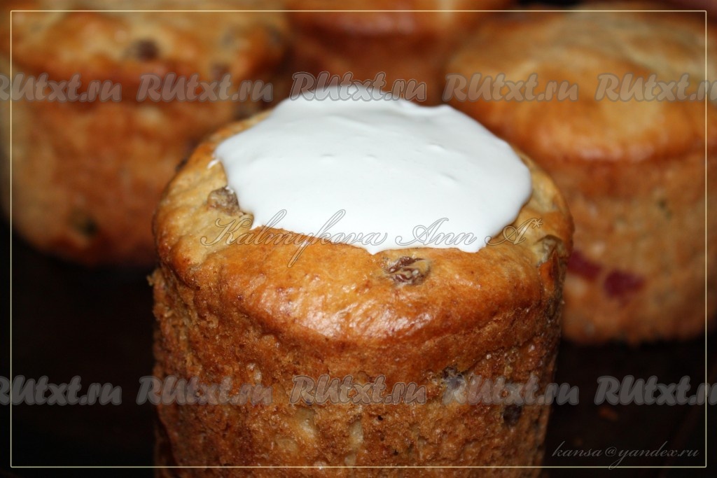 Готовые куличи достать из духовки. Теперь можно приступать к приготовлению глазури, для этого яичные белки нужно слегка взбить миксером, затем, не прекращая взбивать, постепенно добавить сахарную пудру, взбить. Глазурь должна получиться однородной, в меру густой.