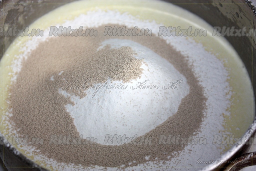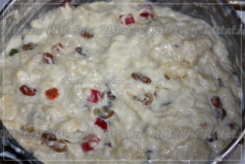 Изюм заранее обдать кипятком, обсушить, разложив на бумажном полотенце. Всыпать цукаты и изюм в тесто.