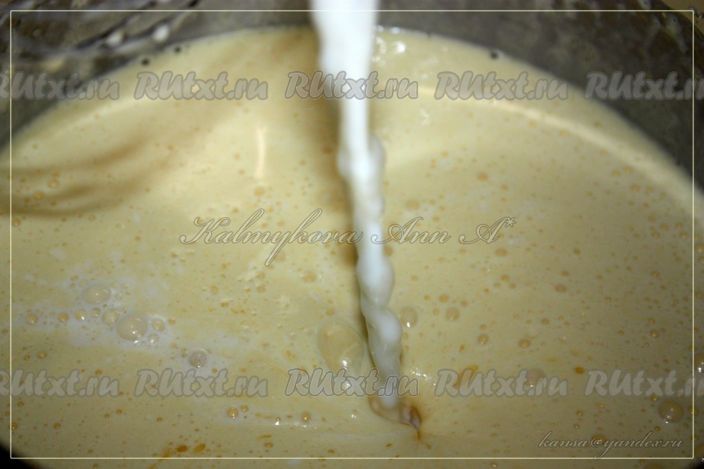 В смесь желтков и сахара добавить растопленное тёплое сливочное масло и тёплое молоко (температура молока и масла 38-40 градусов), перемешать столовой ложкой.