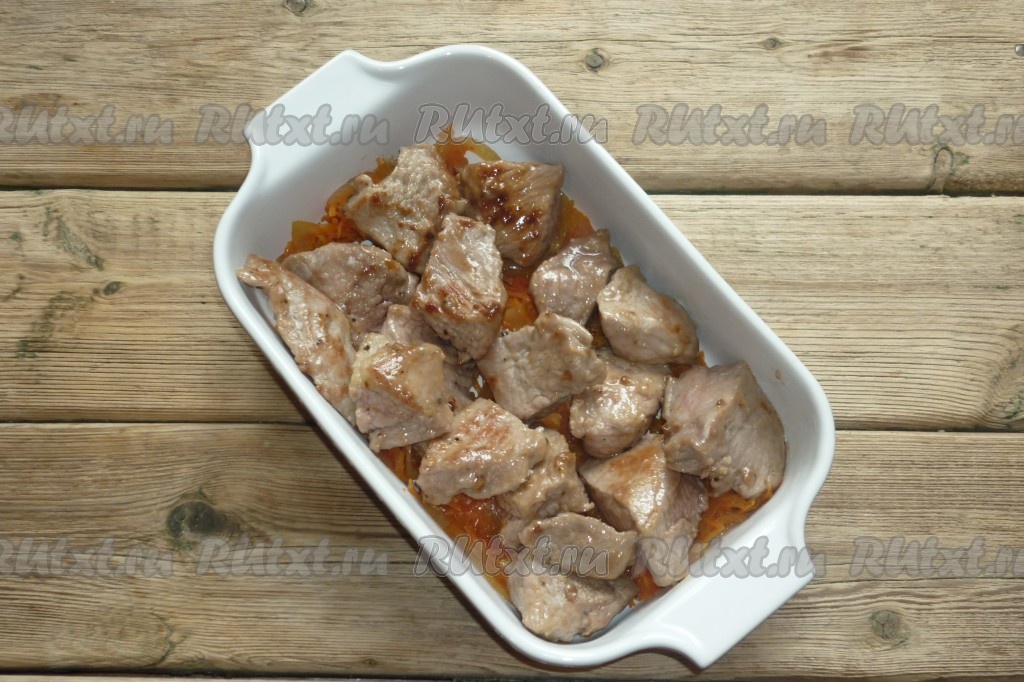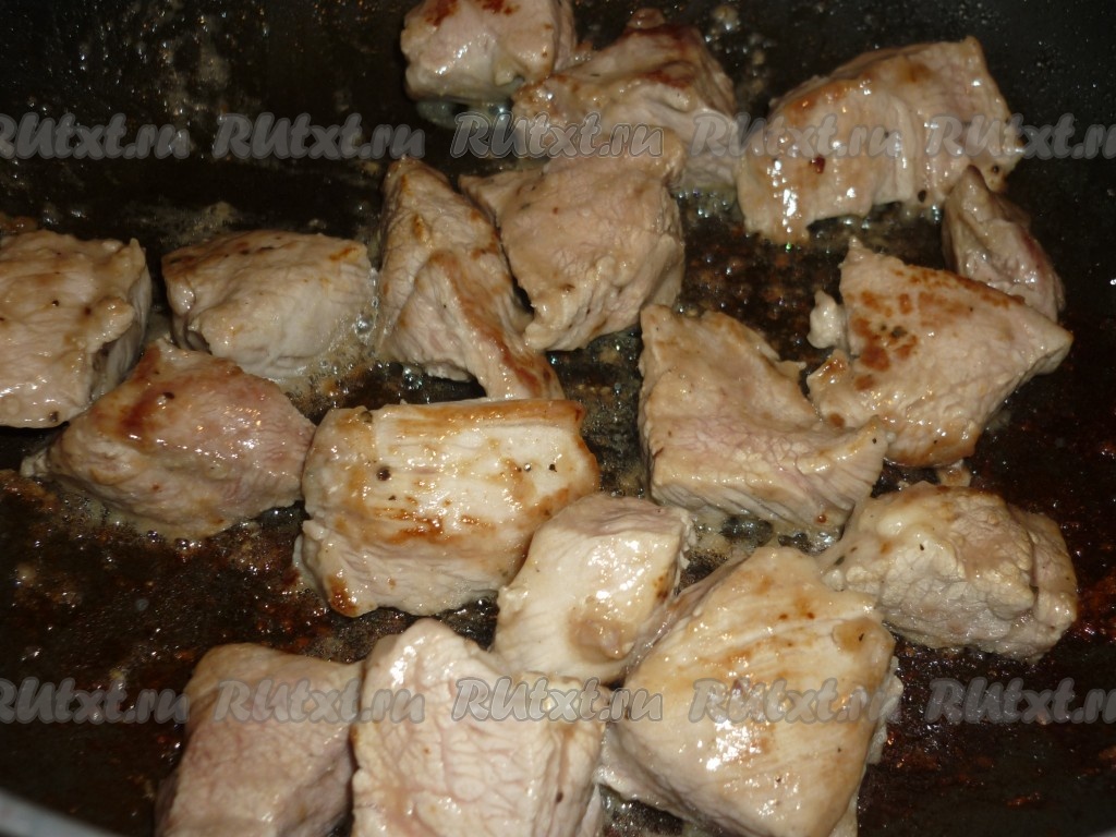 На хорошо разогретой с растительным маслом сковороде обжарить кусочки говядины с обеих сторон до румяной корочки.