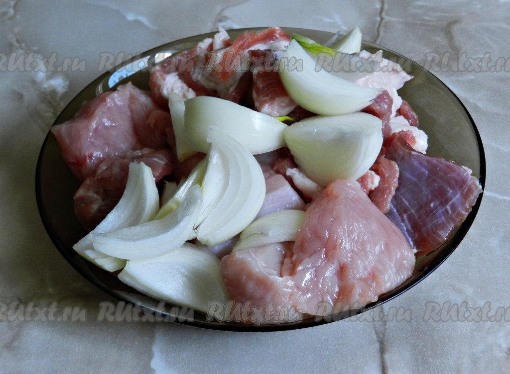 Мясо вымыть, нарезать небольшими кусочками. Лук очистить и тоже нарезать.
