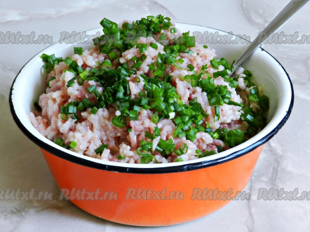 Добавить в фарш зеленый лук. Посолить и поперчить по вкусу, добавить сушеный чеснок.