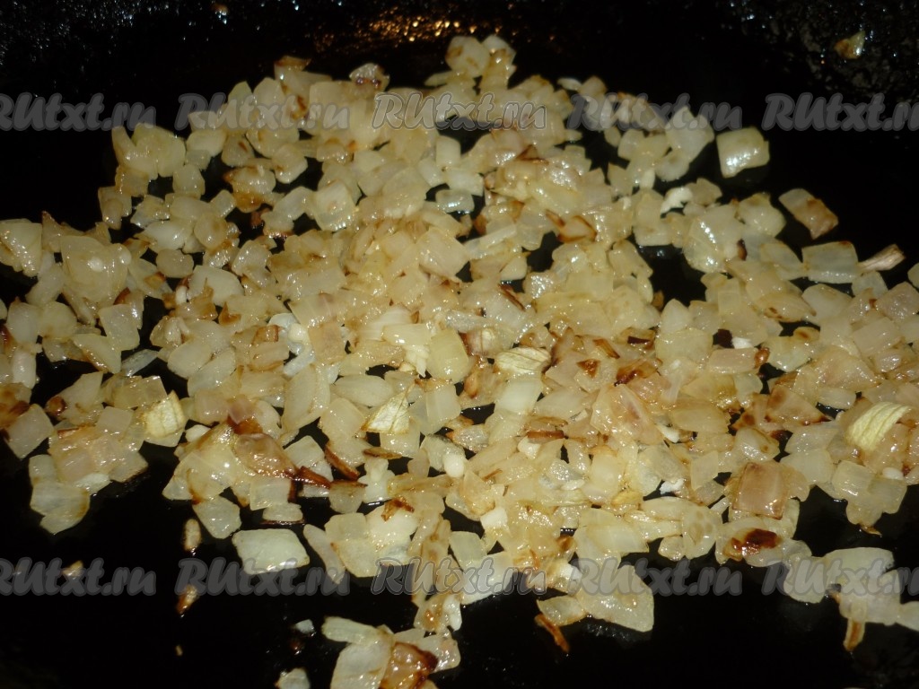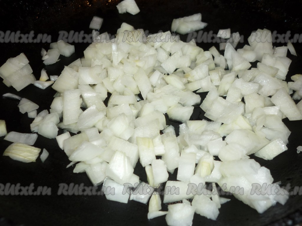 Лук и чеснок очистить. Лук нарезать кубиками и обжарить на растительном масле, помешивая, в течение 2-3 минут.