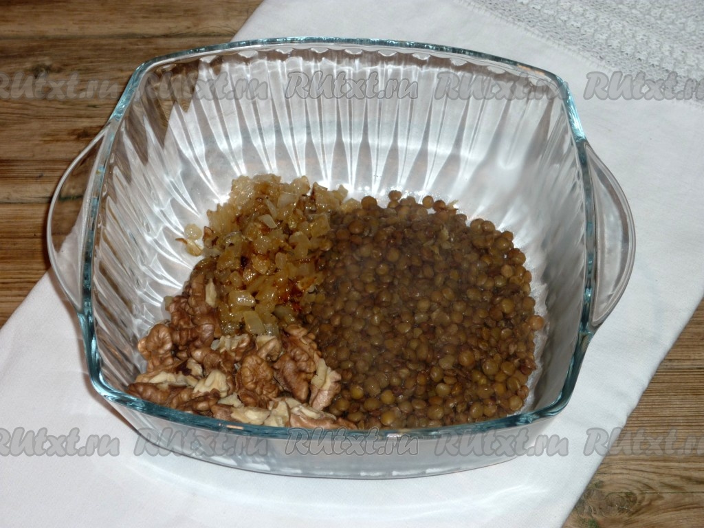 Чечевицу хорошо промыть и залить холодной водой, оставить на 30 минут, затем воду слить. Чечевицу залить новой холодной водой из расчёта 1:1,5 и поставить вариться. Довести до кипения, накрыть крышкой, уменьшить огонь и варить до мягкости, примерно 20-25 минут. Время варки зависит от сорта чечевицы, у меня была зелёная чечевица и за 25 минут она стала мягкой. За 5 минут до готовности чечевицу посолить. Грецкие орехи подсушить, помешивая, на сухой сковороде (это можно сделать и в микроволновке или духовке). Варёную чечевицу остудить, переложить в достаточно объёмную ёмкость, сюда же выложить обжаренные лук и чеснок, подсушенные орехи.