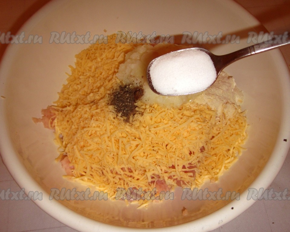 К сыру и мясу добавить соль, чёрный молотый перец и манку.