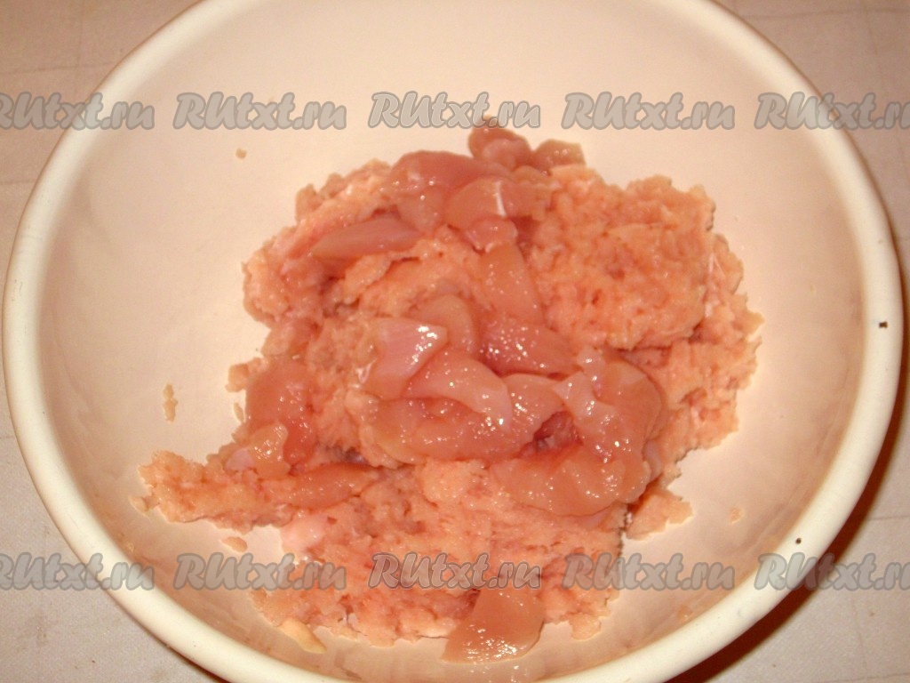 Оставшиеся несколько нарезанных кусочков куриного мяса добавить к приготовленному фаршу.