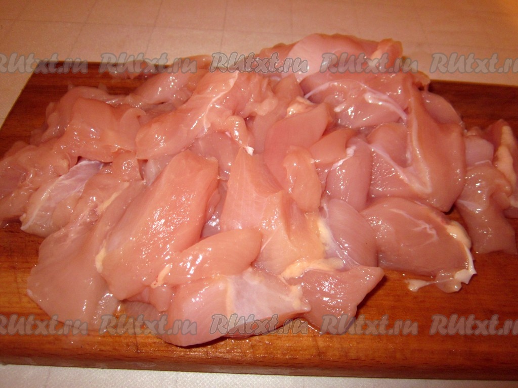 Куриное филе вымыть, обсушить и нарезать на небольшие кусочки. Большую часть куриного филе пробить блендером до получения однородной массы (или пропустить через мясорубку).